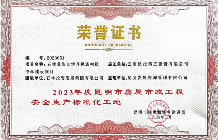 近日,由五〇二直管項目部負責施工的石林彝族自治縣民族初級中學(xué)建設(shè)項目獲評“昆明市2023年建筑企業(yè)目標考核優(yōu)良單位”、“2023年昆明市房屋市政工程質(zhì)量標準化示范項目”、“2023年昆明市房屋市政工程安全生產(chǎn)標準化工地”等榮譽。