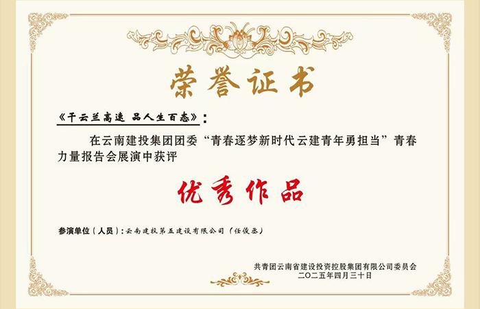 2025年五四青年節(jié),集團舉辦“青春逐夢新時代 云建青年勇?lián)?dāng)”青春力量報告會。展演中,由公司團委、市政路橋四部聯(lián)合編創(chuàng)的脫口秀《干云蘭高速,品人生百態(tài)》作品獲評“優(yōu)秀作品”。