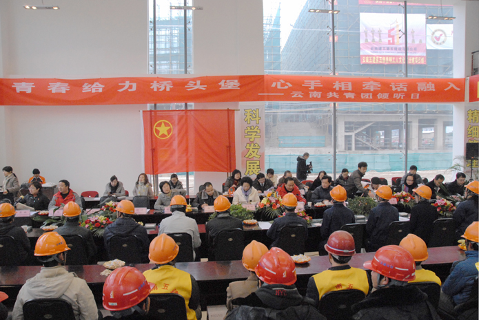 技術(shù)支持: 方森科技 2011年1月16日下午,共青團云南省委邀請部分省人大代表、省政協(xié)委員、昆明市12355青少年服務(wù)臺,青少年事務(wù)教授、專家、律師到公司承建的昆明市工人文化宮遷建項目工地開展主題為“青春給力橋頭堡 心手相牽話融入”的“云南共青團傾聽日”活動,傾聽現(xiàn)場青年的心聲。共青團云南省委書記、省人大常委饒南湖,集團公司副總經(jīng)理楊濤,黨委委員、黨委工作部部長陳發(fā)強,團委副書記雷棲,公司副總經(jīng)理李興奎出席活動并與青年們座談。團省委權(quán)益部部長吳琳、楊濤在座談會上發(fā)言。座談會由共青團云南省委副書記楊金瑩主持。