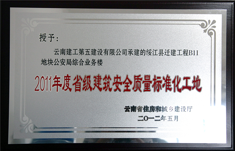 綏江項目部承建施工的綏江縣遷建工程B11地塊公安局綜合業(yè)務(wù)樓工程獲“2011年度省級建筑安全質(zhì)量標(biāo)準(zhǔn)化工地”稱號